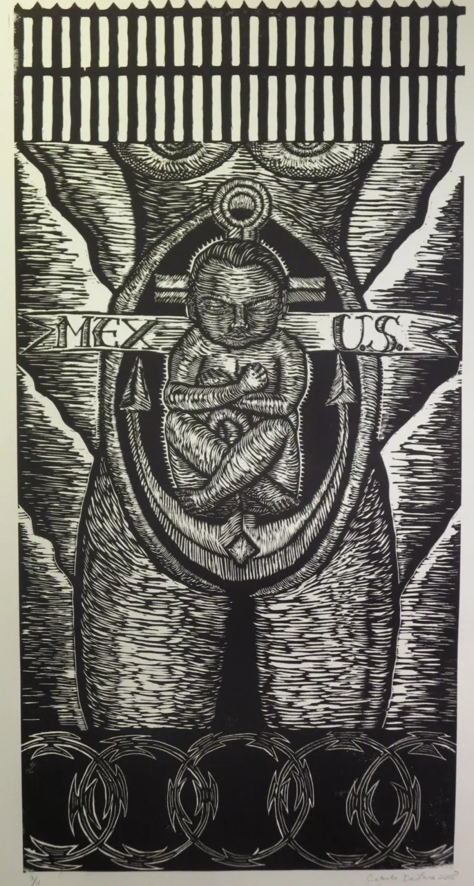 “My work is a tool to understand and deconstruct oppressive paradigms in my physical/spiritual/psychic environment. The confluence of American and Xicano culture clash and sometimes harmonize in my work. My seemingly morbid interests go well with the death and despair of the border experience. Common themes in my work include migrant/border experiences of women, children, and families, Tejas landscape, and the spiritual struggle of conflicting identities. My practice is rooted in writing, drawing, carving, and taking photographs. At times, my process is like child’s play with props and collected objects. These things manifest themselves in drawings and eventually artworks that can be paintings, drawings, prints, or assemblage.”