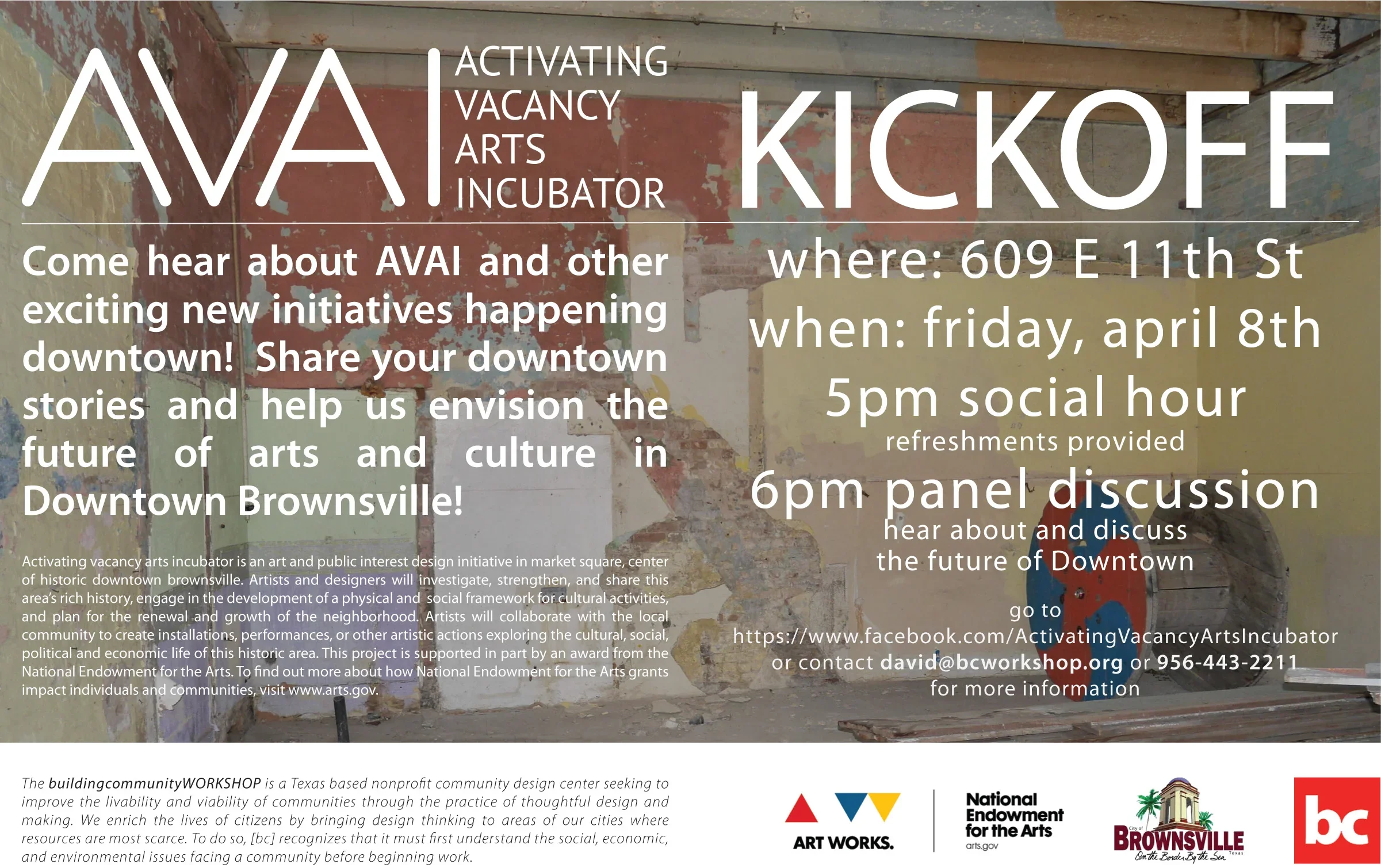 [bc] is excited to announce a kickoff for the Activating Vacancy Arts Incubator (AVAI), a new art and public interest design initiative in Market Square, the center of Historic Downtown Brownsville. This program will create a viable means for artists to thrive in a region where attaining basic needs can be a struggle. The incubator will provide a catalytic hub for Downtown Brownsville and the arts, creating a platform for artistic production and collaboration between artists and the community. AVAI begins Spring 2016 and is produced and curated by [bc] in partnership with the City of Brownsville.
