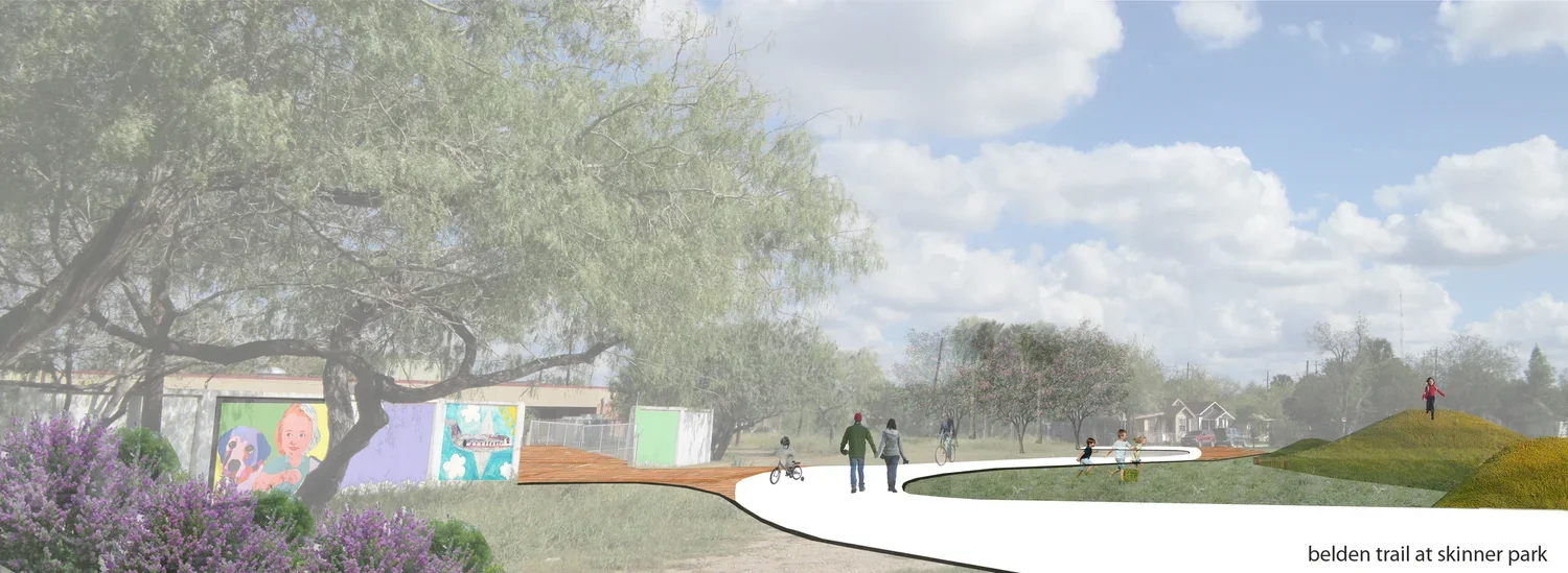Belden Connect is an extension of the existing mile-long Belden Trail that will run from Palm Boulevard and connect to 6th Street in downtown Brownsville. With funding from the City of Brownsville, it will reactivate another stretch of the abandoned railroad easement before turning onto Old Alice Road, where there will be a dedicated bike and pedestrian lane that is safely separated from vehicular traffic. The amenities from the existing trail, which range from custom benches, trash cans, native vegetation and pavilions will continue onto the extension. The connection to downtown will link the Belden Trail to the Mitte Cultural District and the Historic Battlefield Trail.