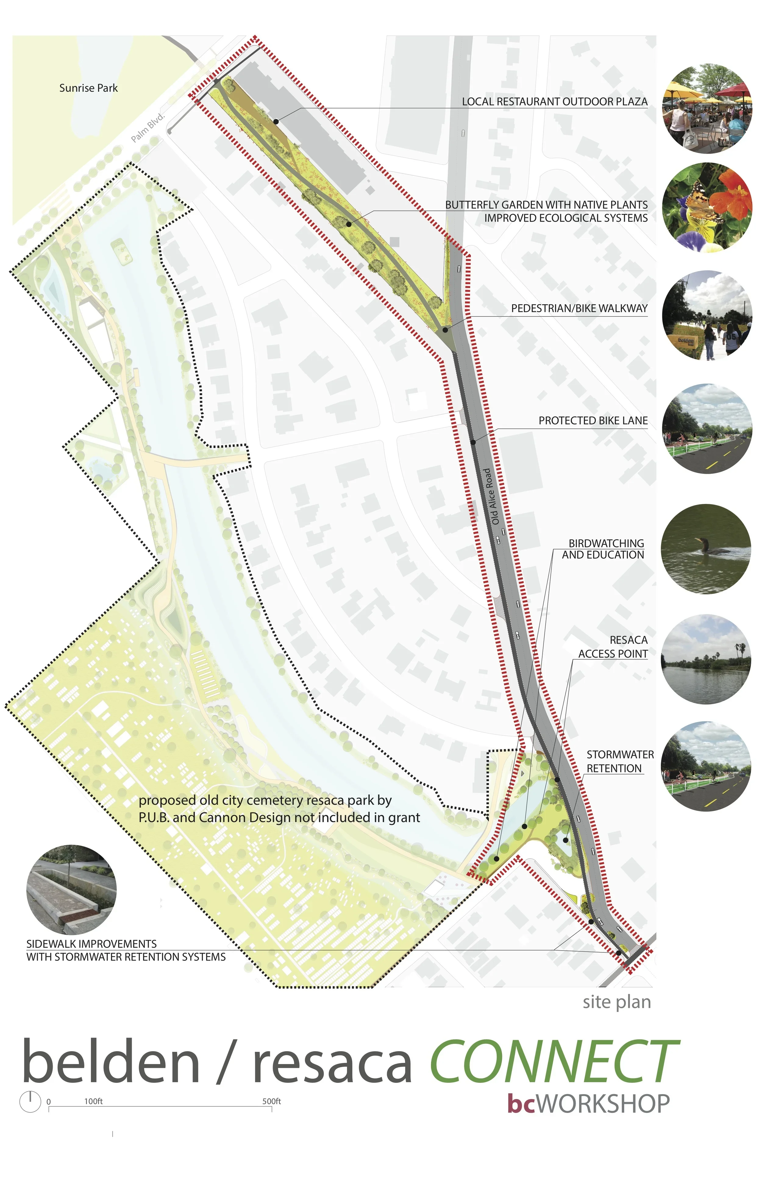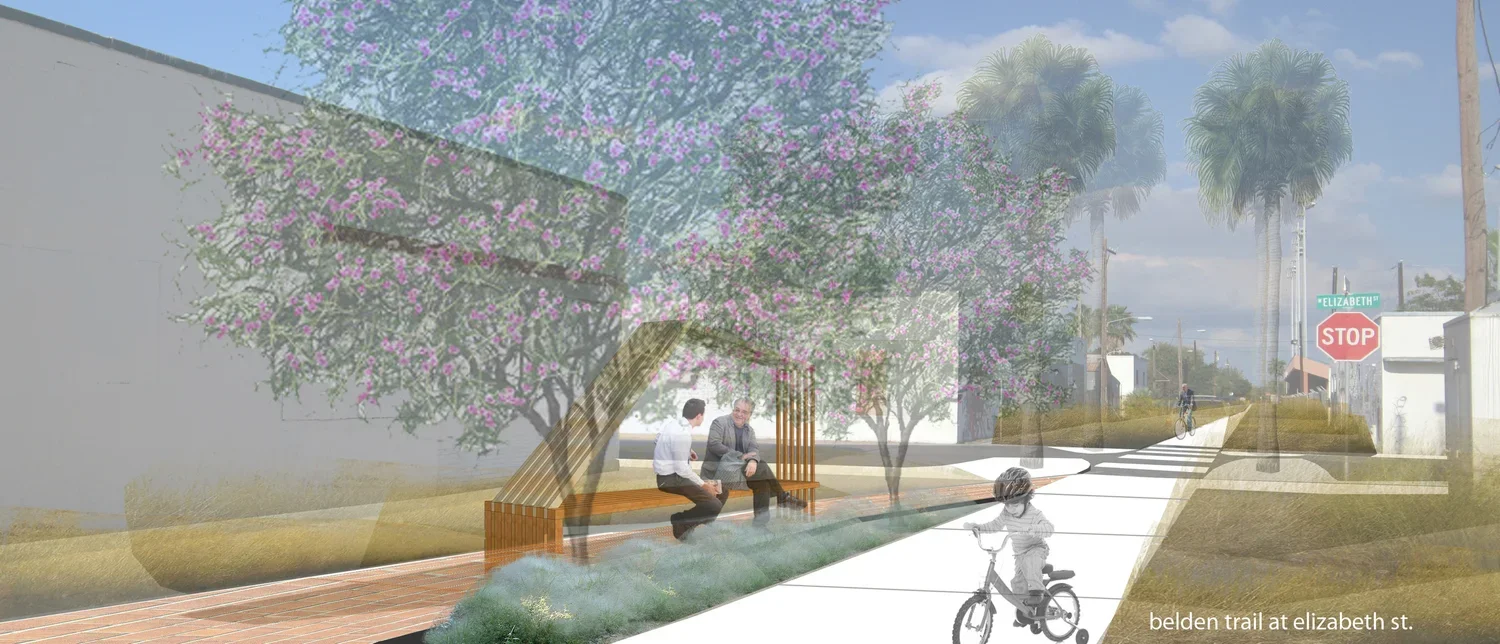 The Belden Trail, once an abandoned rail line, is now part of the City’s growing network of walking and biking infrastructure. Named after one of the City's founders, Belden Street was converted to an extension of the West Rail Line, then abandoned to backyard alleys, and has now been reclaimed as 5,170 linear feet of accessible park. It is book-ended by Sunrise Rotary Park and Riverside Park and connects to three different schools. The neighborhoods that have direct access to the trail are diverse, but primarily low-income, with many families and elderly that rely on alternative forms of transportation.