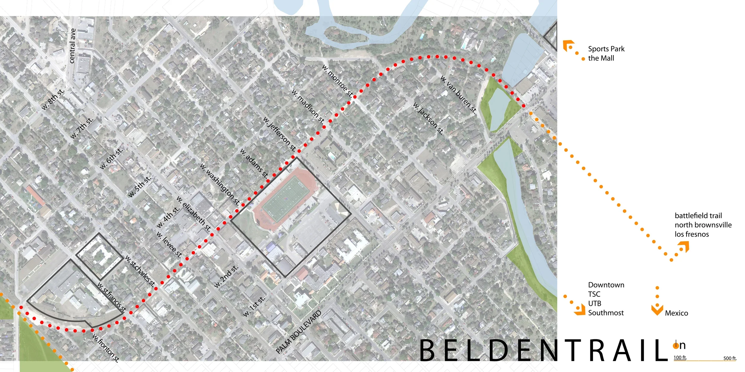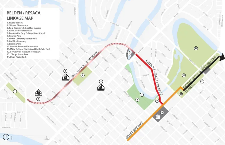 The project proposes extending the Belden Trail towards 6th St in Downtown Brownsville to connect to the Mitte Cultural District, museums, and the exiting Historic Battlefield Trail.