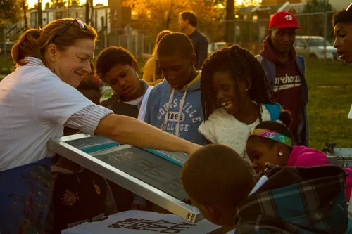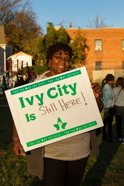 On Sunday, November 6th, we celebrated the opening of “Ivy City Is…”, a collaborative, resident and artist-led creative project that culminated in the creation of a three-dimensional, 5’ by 20’ screenprinted, plywood installation, spelling out “IVY CITY”. This project is intended to celebrate the neighborhood’s rich heritage and foster a dialogue about Ivy City’s identity in the face of rapid development and demographic change. Over 200 Ivy City residents, creatives, and community stakeholders joined us at this event with on-site screen printing, free t-shirts, food, and performances by local artists at Lewis W. Crowe Park.