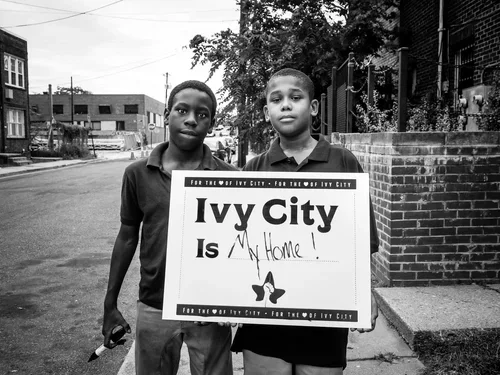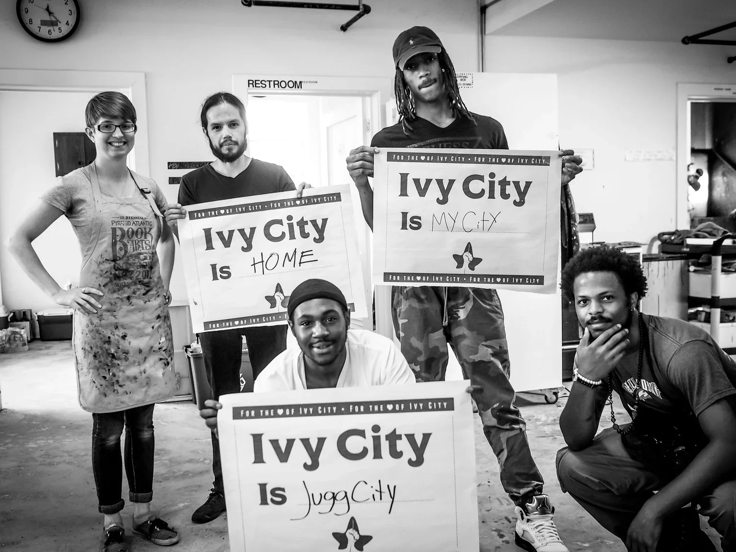 Each letter was crafted using a collage of historic photos, maps, and portraits of residents who customized individual yard signs declaring what Ivy City means to them. A diverse community of local artists collaborated with area youth to host a series of free screen printing workshops, where residents learned how to screen print and helped create the seven large letters that spelled out “IVY CITY”. Prior to this celebration, these individual letters were on display in key locations throughout the neighborhood, including Bethesda Baptist Church, Louis Carryout, Hecht Warehouse, and Trinity Baptist Church.