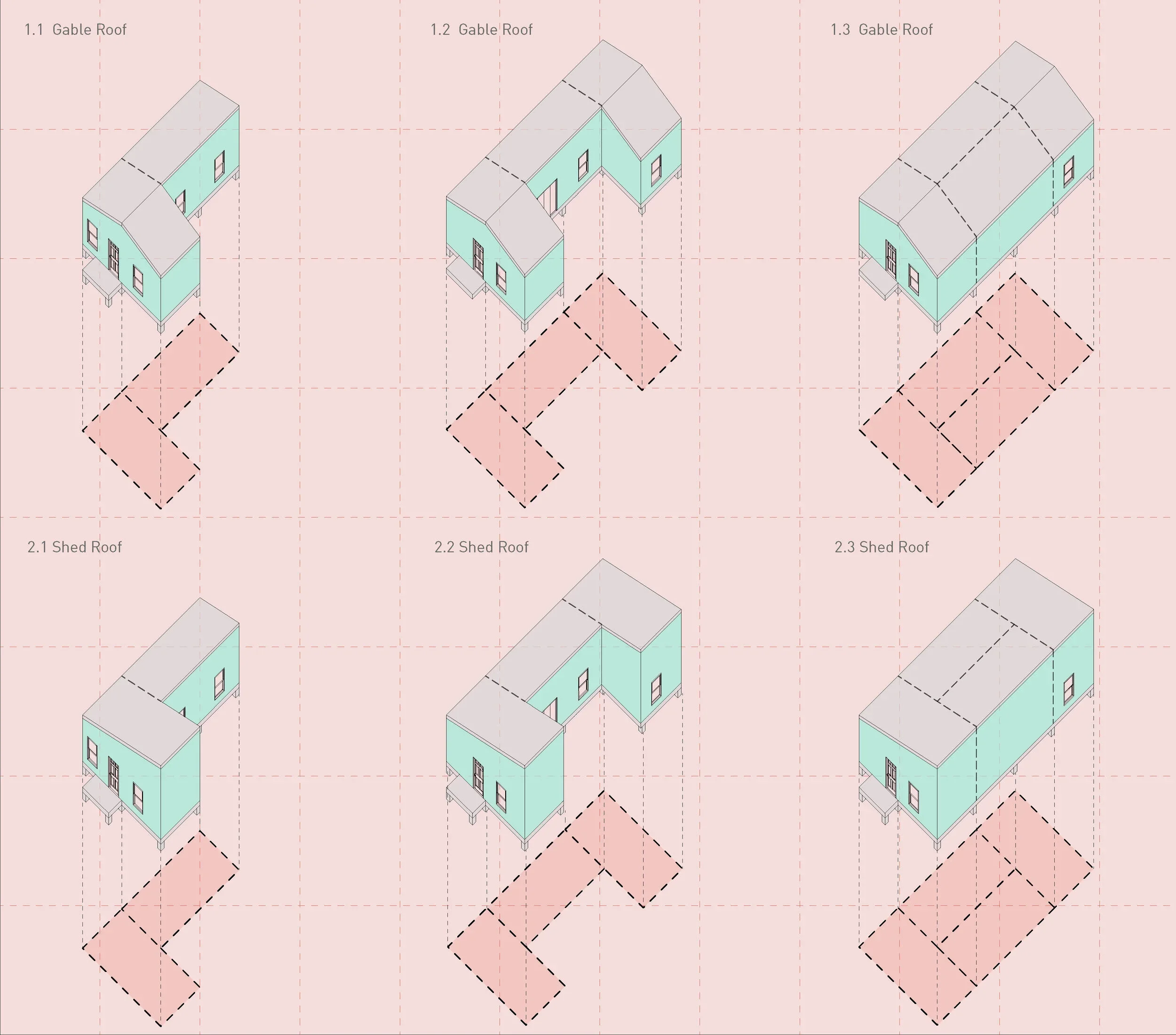 The graphic below represents the L core diagram, with the two “Smart Boxes” coming together to illustrate the process of the grow-home model. The top shows Gable Roof and the bottom shows a Shed Roof.