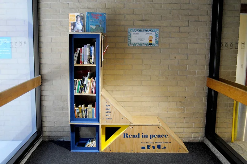 This scheme was inspired by the police officers, who were all unique individuals who came together to work as one unit. The unique geometric qualities of each library are meant to represent this bond. Proudly painted blue and yellow, all libraries display the fallen officers’ badge numbers, the “Read in Peace” slogan, and other personal memorial items from the Stassen family that address people affected by gun violence.