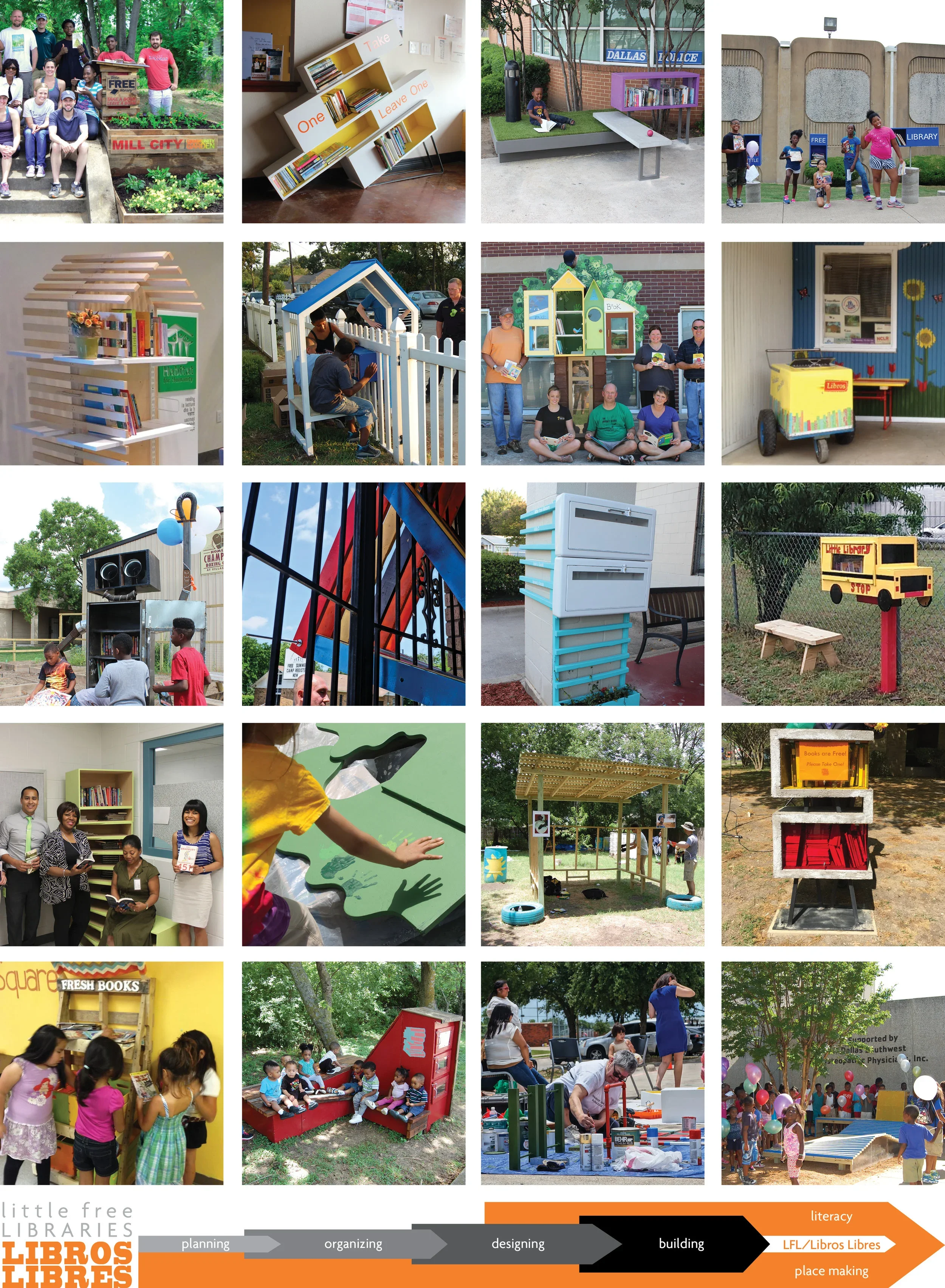 Little Free Libraries/Libros Libres is a literacy and community design initiative in Dallas, TX that pairs neighborhood residents and organizations with local designers to build small book shelters, creating new gathering spaces that promote literacy and community building. Part of the Little Free Library movement, started by Todd Bol and Rick Brooks, this project promotes community ownership, encourages frequent use, and ensures the longevity of each library, improving the built environment alongside literacy in urban areas.