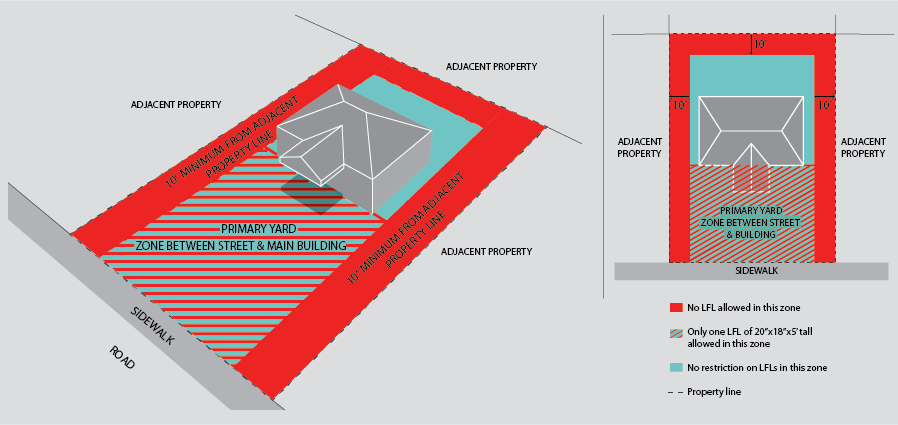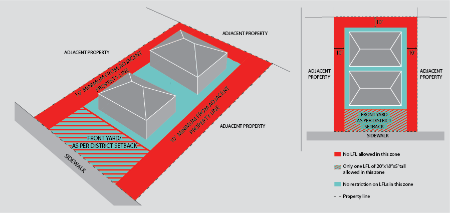 Proposed amendments are rigid on location and size. Size and location requirements in the front yard limits LFL to small boxes located in very specific locations that leave no scope for creativity.