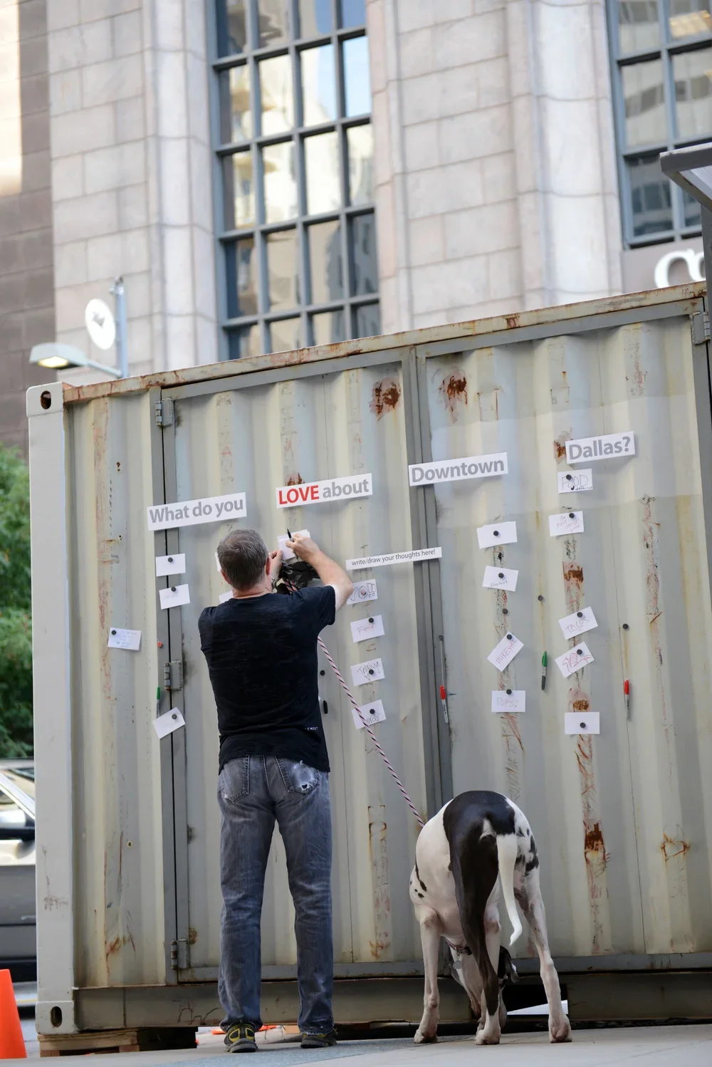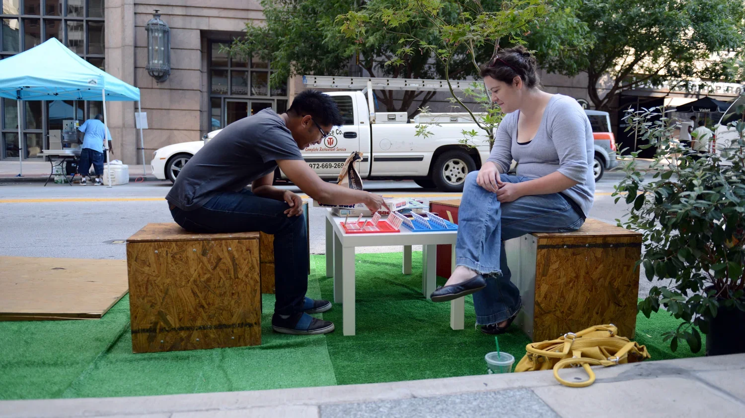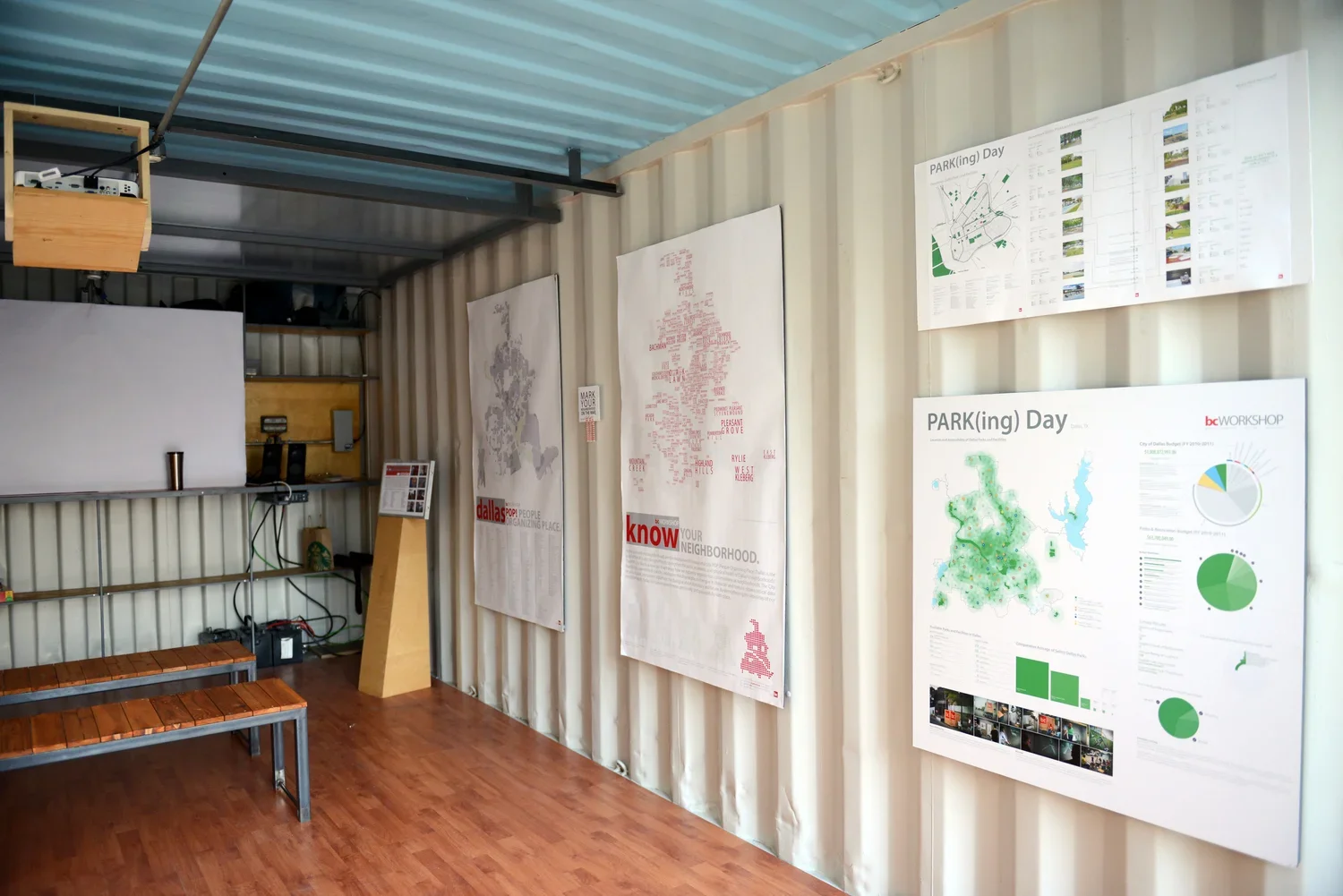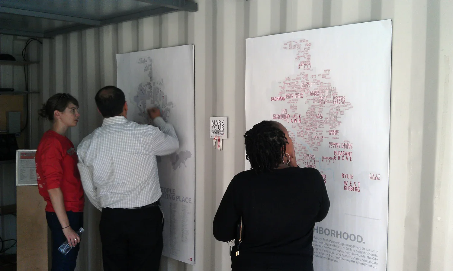 PARK(ing) Day is an international one-day celebration of people re-purposing parking for other activities not centered on the car. For Dallas's second annual PARK(ing) Day, we brought our 20-foot long commissary container over to the one of the parking spaces along downtown Main Street. Inside the container, we displayed the POP City Map along with a map locating green spaces in Downtown Dallas. A small theater was set up for projecting our collected Neighborhood Stories, while we also recorded new ones them from passersby on the street. Outside, visitors played board games and placed notes on the exterior of the container sharing what they love about Downtown.