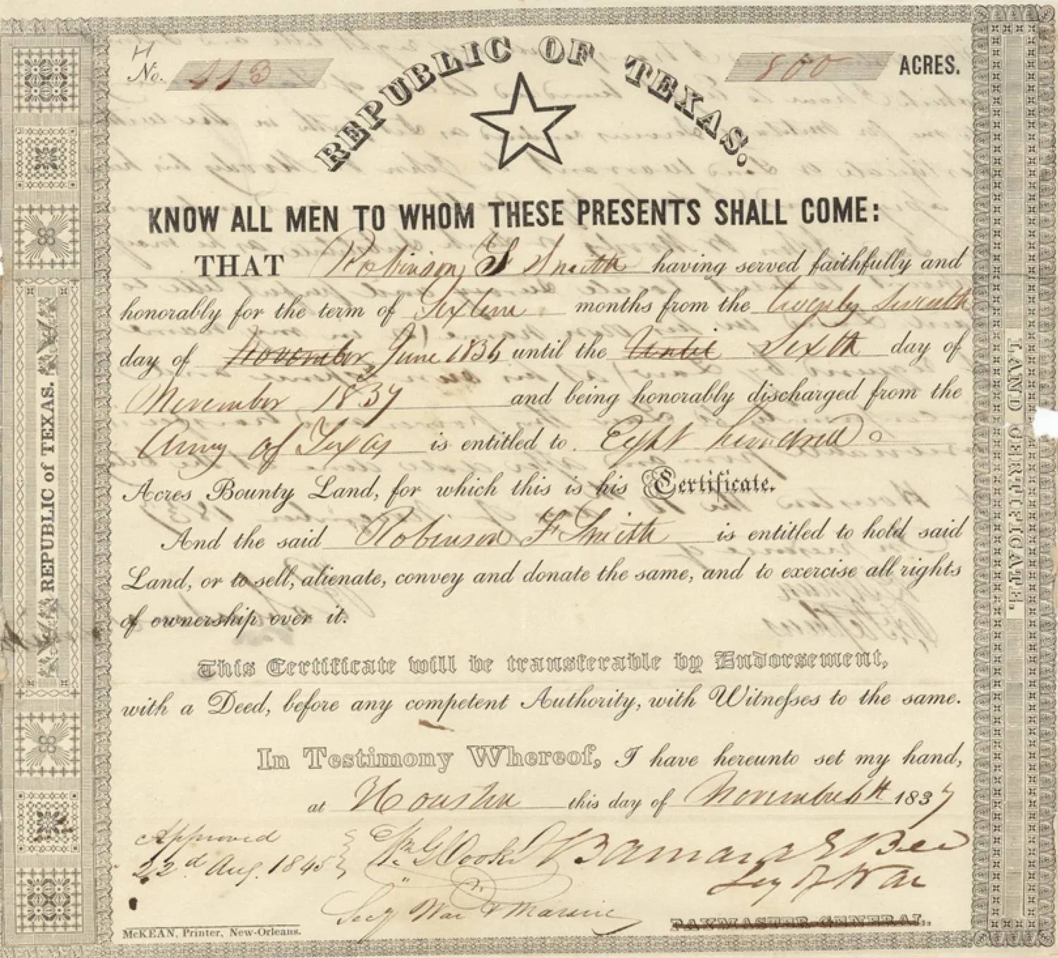 Texas Land Grant. Dallas, Texas: 1837. LINK