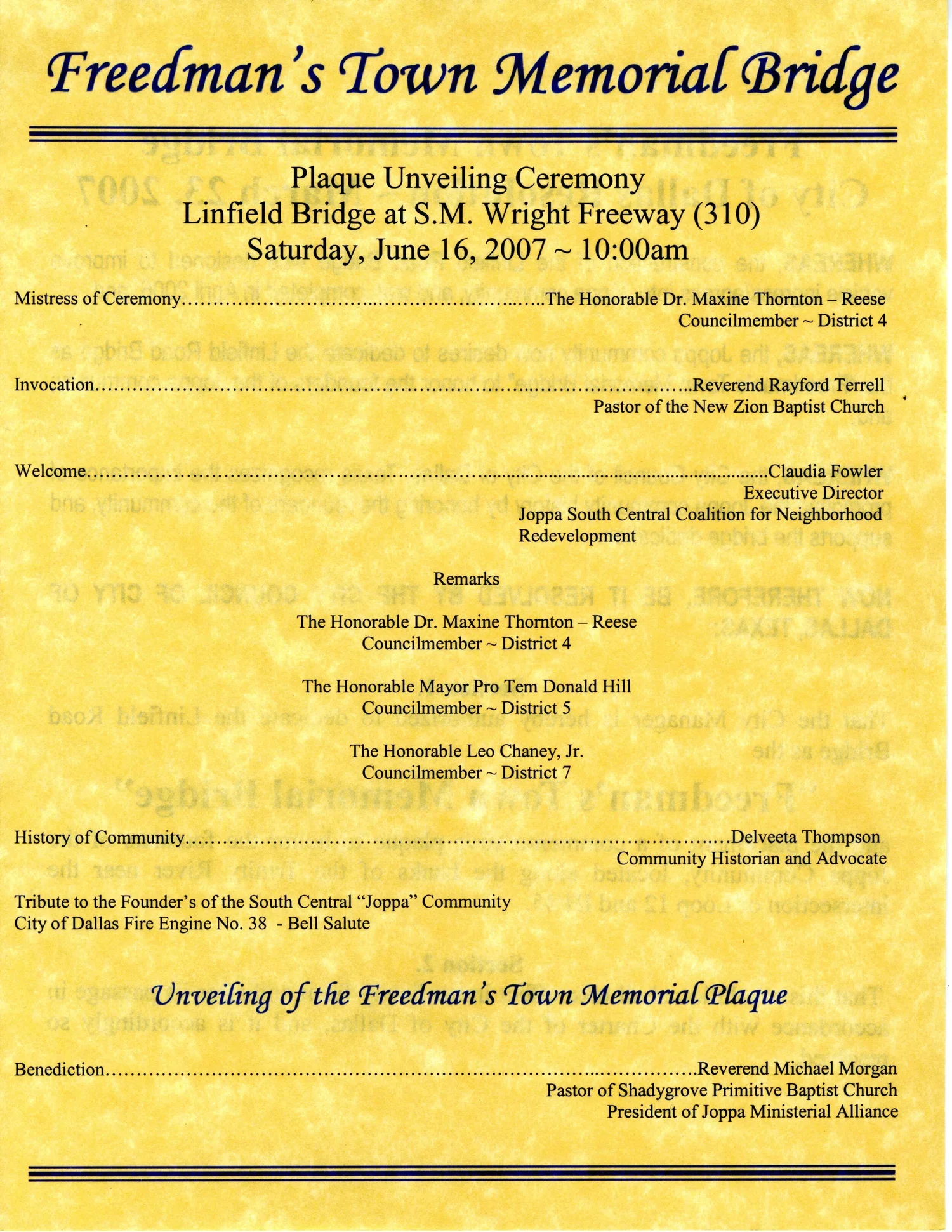 The South Central Civic League continued to fight for improvements in the neighborhood. Up until the 1970s, residents would carpool to public transportation. The neighborhood organized to get bus service along Carbondale, which would take residents to the end of the Ervay Streetcar line in South Dallas, or to downtown. In an interview, Mrs. Delveeta Thompson describes the work of Mrs. Charlie Mae Jackson, who led the South Central Civic League from the 1990s to 2000s, to improve infrastructure in Joppa. A 1955 street map shows that the neighborhood was practically divided in half, connected only via Carbondale Street. Edgar Green describes the division: “Fosters crossing Honey Spring Branch - that's the river, the creek that runs through here, they called this Honey Springs. You know, believe it or not, before that you had to come out and go down Burma road and then go down here to Carbondale to go to the other side. We only had, you know, one way to get to the other side.” Mrs. Foster worked with residents to have a direct connection built between the two halves of the neighborhood. And on May 15, 1999, a plaque was placed near Gethsemane Missionary Baptist Church, declaring it “Foster’s Crossing” in dedication to South Central Civic League leaders Laura Belle Foster and P.H. Foster. Although Mr. Foster passed away before the project was complete, Mrs. Foster was able to see the street and travel Foster’s Crossing herself.