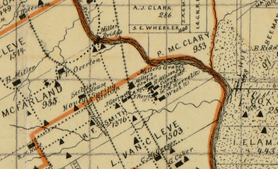 It was around the time of the New Zion’s relocation to Joppa that the Missouri, Kansas, and Texas Railroad was constructed, arriving near Joppa in 1886 with Miller’s Station. While the area remained agricultural, the new local infrastructure brought increased development, including the establishment of Honey Springs, a nearby town settled around a H.&T.C. station of the same name. An article in the Dallas Morning News indicates that in 1888, Henry Critz, the founder of Joppa, was living in nearby Millers Switch. A 1930 article written by the grandson of W.B. Miller wrote that Critz continued to operate the Miller Ferry until 1890, when a flood washed out the landing. The Miller’s Ferry Bridge was built soon after, making the ferry service obsolete.