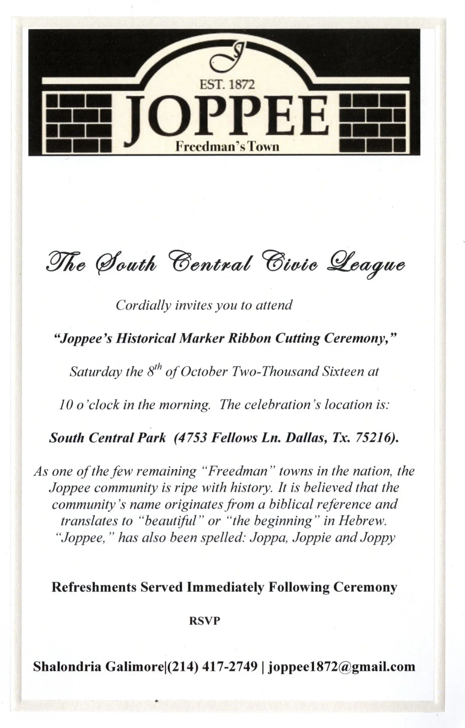 In the past decade the neighborhood has continued to see change. Over 100 new homes have been built, bringing new residents to the area. While the Melissa Pierce School remains closed, residents would like to see it returned to a community use. Since there is no school in the community, students go to school at South Oak Cliff, Roosevelt, or other schools throughout Dallas. In 2015, South Central Park, with a gazebo and splash pad was opened. The following year the neighborhood celebrated the unveiling of its historical marker at the park. The South Central Civic League continues to operate to this day, fighting for the neighborhood. In addition to working toward building a community multipurpose center and putting in place a neighborhood stabilization overlay, fifth generation Joppa resident and current Civic League president Shalondria Galimore was a vision for the neighborhood: