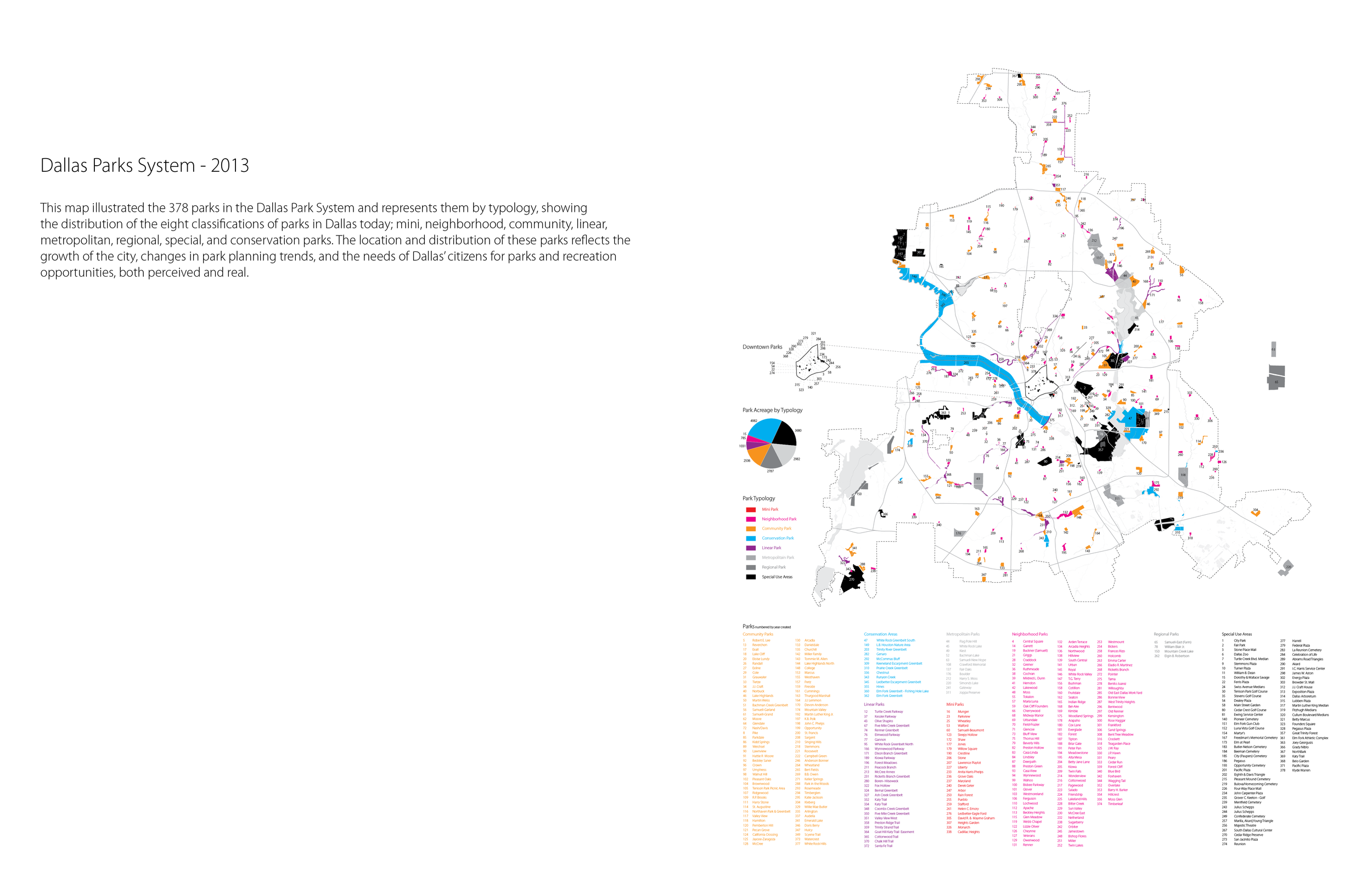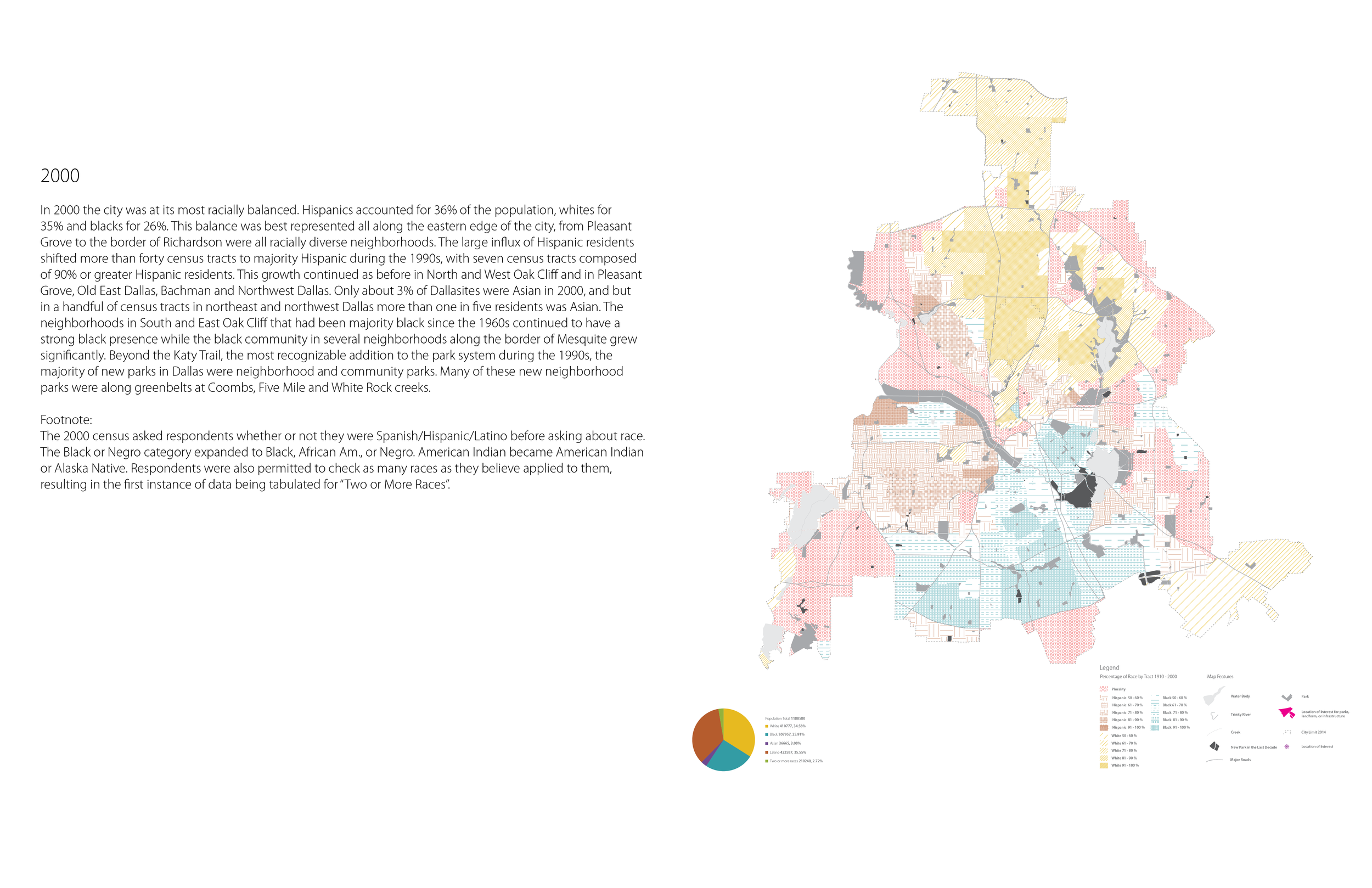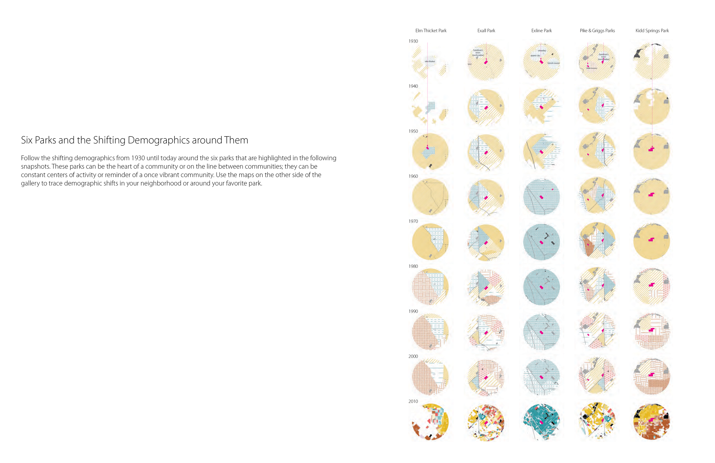 To provide a comprehensive understanding of how the racial makeup of the city has shaped the design and use of public space, the exhibition was composed of four parts: a series of ten historic maps and one contemporary map that trace residential patterns by race and the parks system; an annotated timeline of the evolution of Dallas parks and park typologies over the last 100 years; a series of diagrams that illustrate parks as tools for or sites of nine types of social, economic, infrastructural, and civic controls; and a series of snapshots that illustrate the impact of these controls as they relate specifically to parks and race in the city of Dallas.