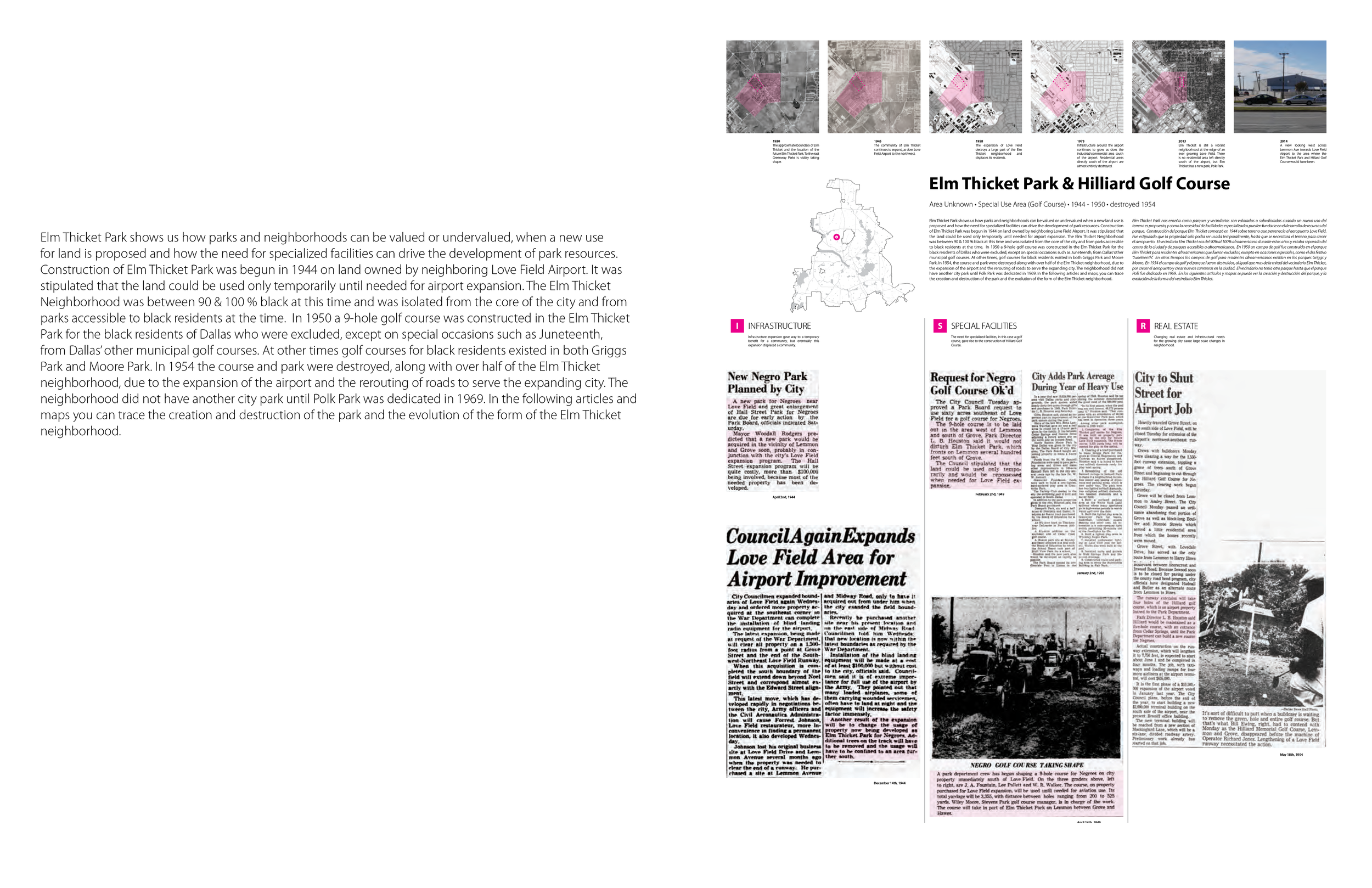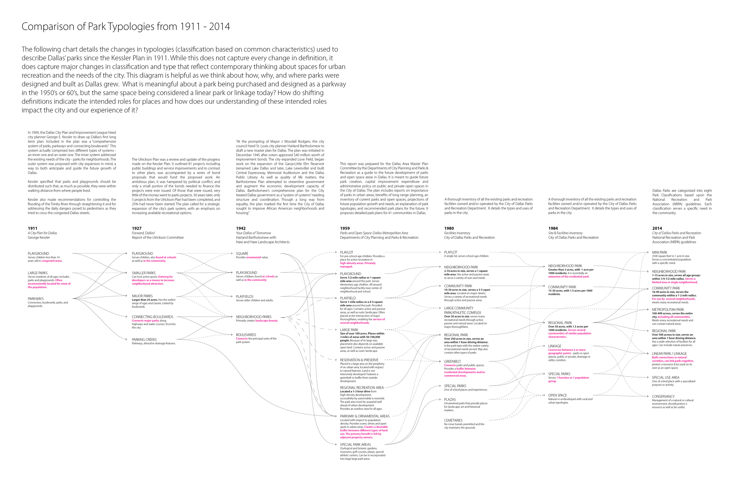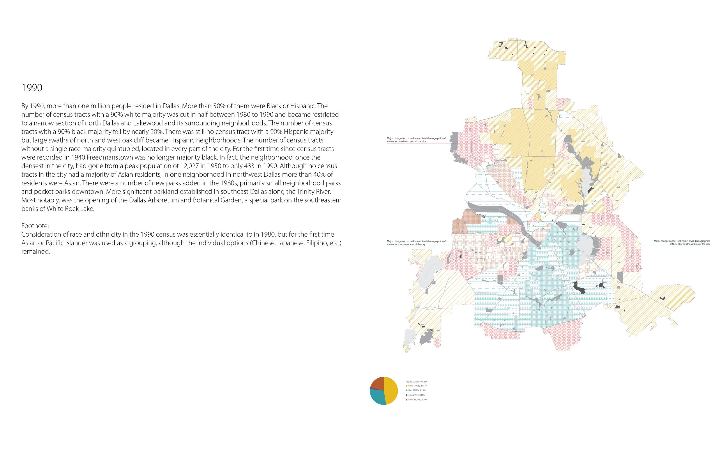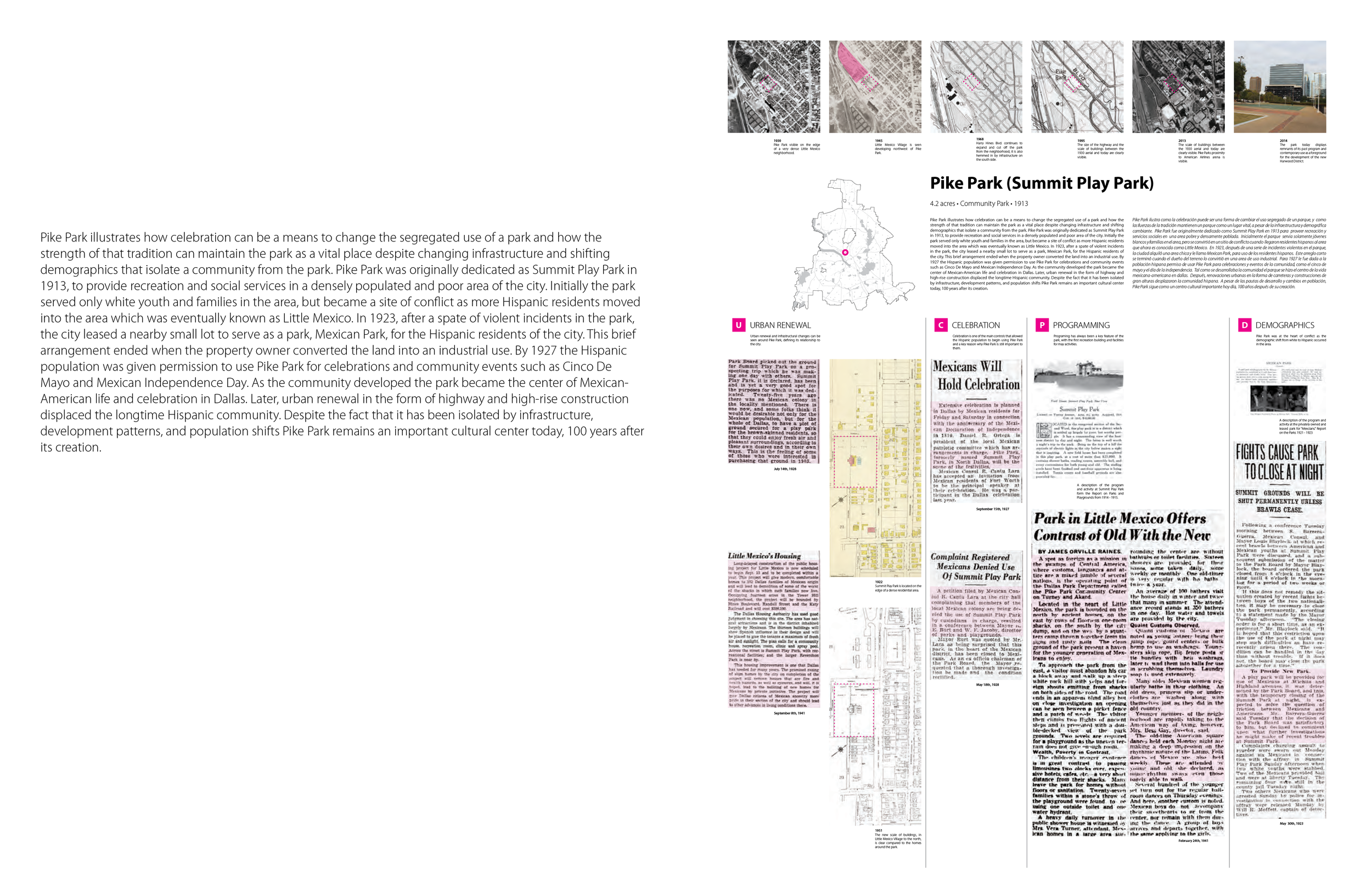 To provide a comprehensive understanding of how the racial makeup of the city has shaped the design and use of public space, the exhibition was composed of four parts: a series of ten historic maps and one contemporary map that trace residential patterns by race and the parks system; an annotated timeline of the evolution of Dallas parks and park typologies over the last 100 years; a series of diagrams that illustrate parks as tools for or sites of nine types of social, economic, infrastructural, and civic controls; and a series of snapshots that illustrate the impact of these controls as they relate specifically to parks and race in the city of Dallas.