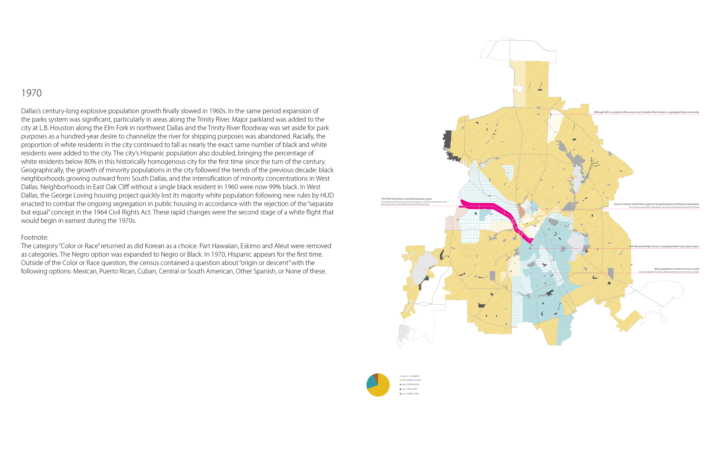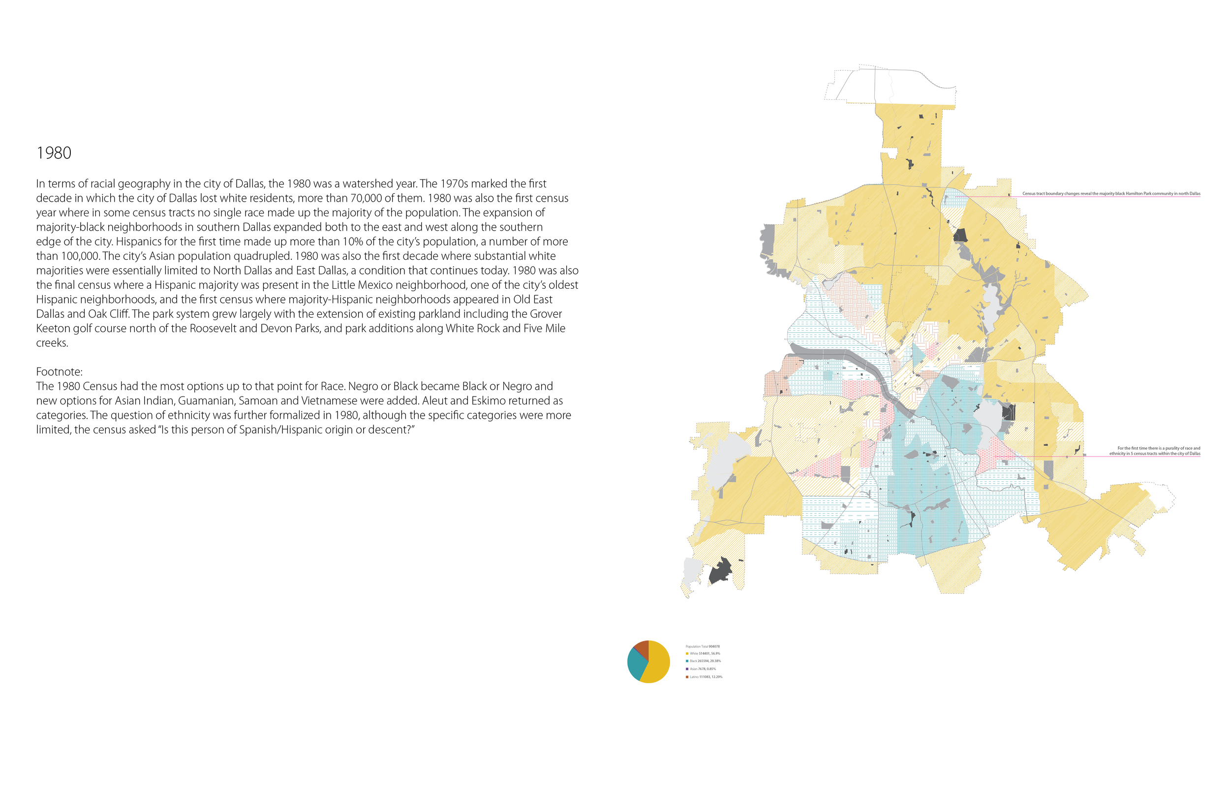 Race and the Control of Public Parks is a 100 year history of the relationship between racial migrations in Dallas and the development of the city’s park system. An exhibit of graphical and historical research, Race and the Control of Public Parks makes evident that while parks are technically public and that all citizens are, in theory, automatically welcome, we must recognize the ways in which the design, construction, programming, use, and alteration/renovation of public parks can reinforce divisions, both physical and perceived, between populations. Launched on November 14 to coincide with the Facing Race Conference, a national assembly tackling racial justice, this project is just one component of an important critical conversation about racial inequity in cities.