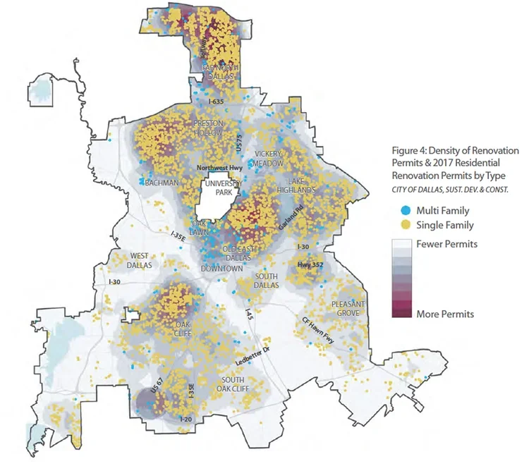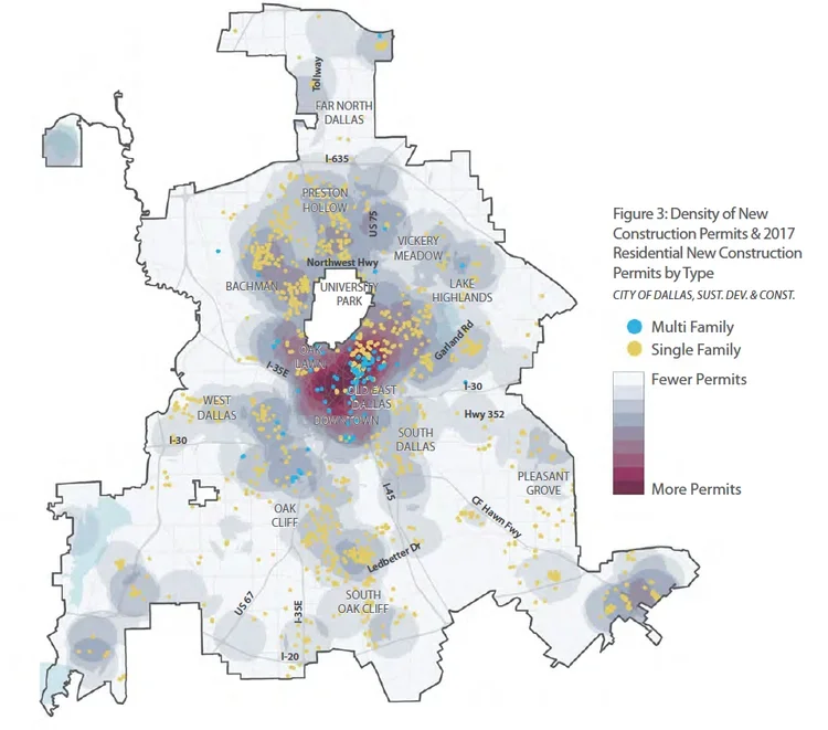 The region’s rise in population, new housing, employment, and income exemplifies the uneven nature of development and economic growth across North Texas. Growth in the region is concentrated in specific cities and neighborhoods, while other areas have experienced less measurable change in recent years. Housing production has followed this growth in parts of the region. However, housing production in the city of Dallas has been heavily concentrated in just a few of the Dallas’ nearly 400 neighborhoods despite more widespread growth across Dallas.