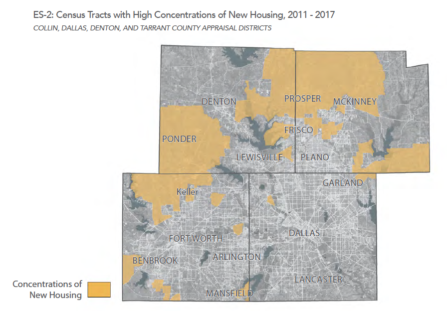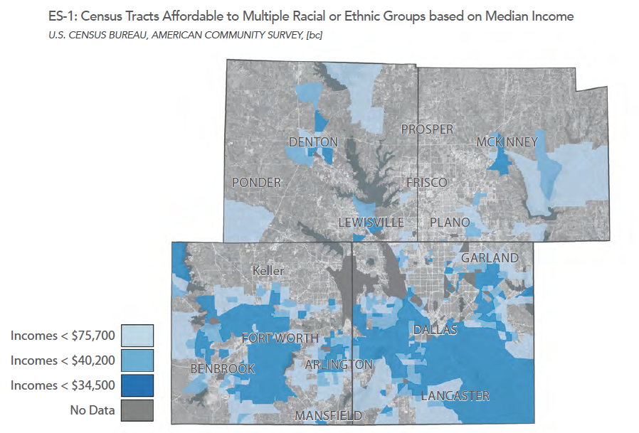 The maps and graphics included in the report illustrate longitudinal trends in housing production and new residential construction, as well as growth in population, jobs, and income, across Collin, Dallas, Denton and Tarrant counties. The report looks at median incomes by racial and ethnic group and by industry of employment in relation to average housing costs by Census tract.