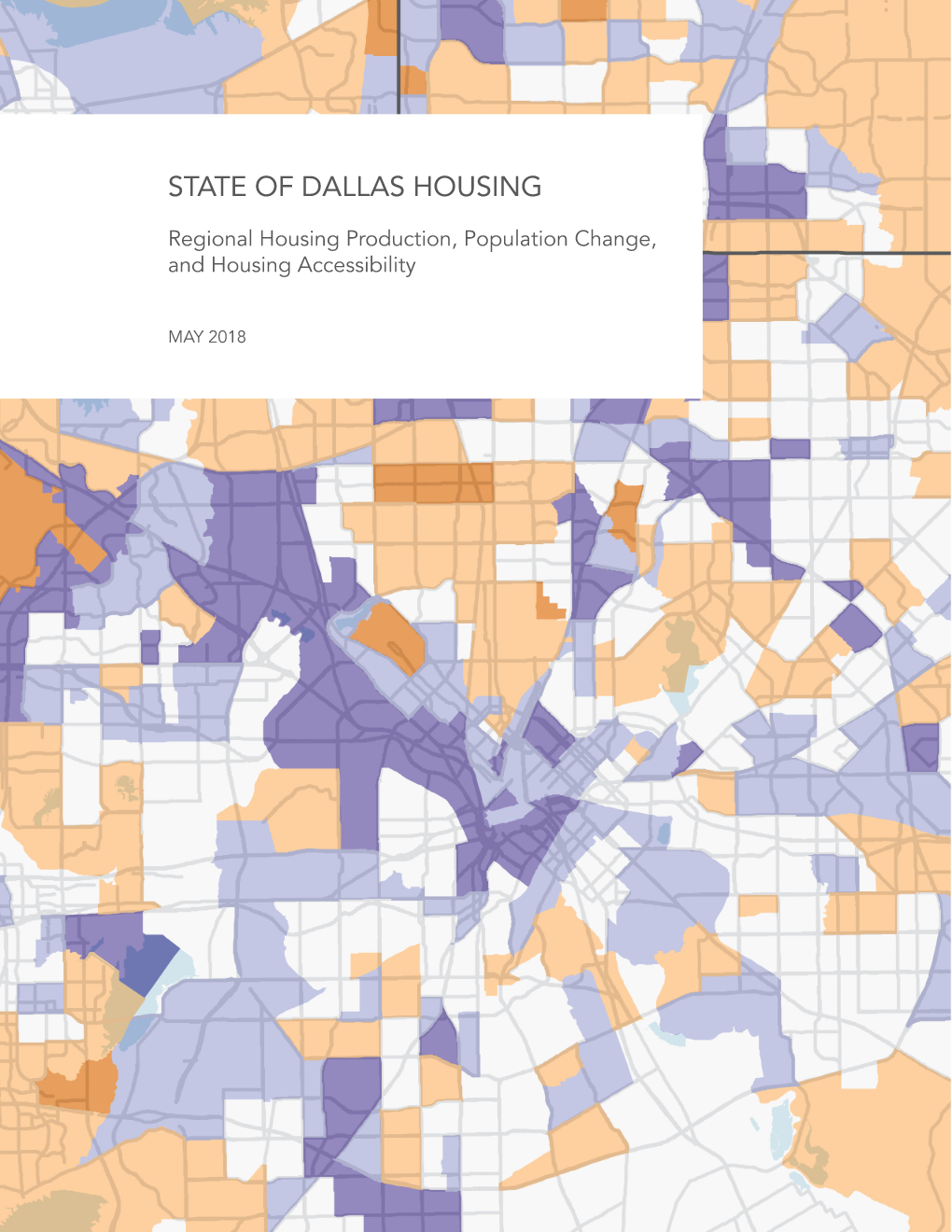 In 2017 North Texas continued to be one of the fastest growing regions in the United States, and one of the top housing markets in the United States. As the City of Dallas’ prepares to implement its recently passed housing policy, aimed at increasing the production of housing units across the city, it is important to understand housing production at a larger scale to pinpoint where new housing units or typologies may be needed at this critical juncture. The 2018 State of Dallas Housing Report explores current housing trends in the City of Dallas and socioeconomic trends across the four most populous counties of North Texas (Collin, Dallas, Denton, and Tarrant) to help contextualize housing production and identify potential challenges and opportunities for improving access to housing for residents of Dallas and North Texas.